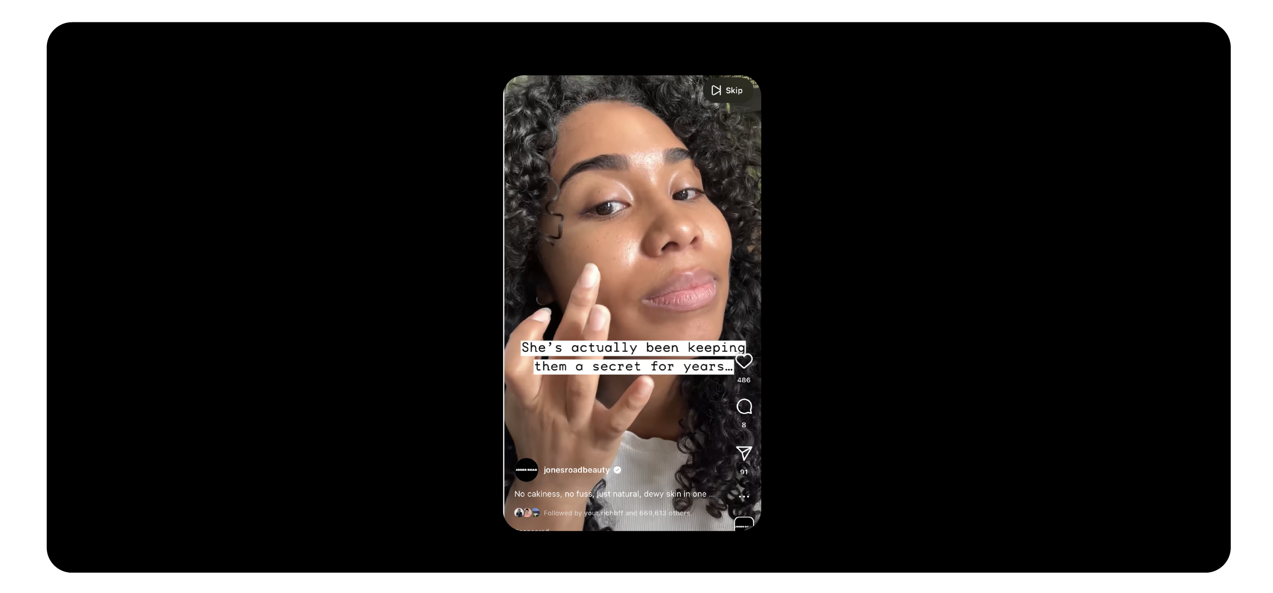 The format is straightforward. As you’re scrolling through Reels, a countdown timer appears in the top-right corner signaling an incoming ad. Then the ad plays with a “skip” button that lets you bail out and return to the beginning of the Reel you were watching.