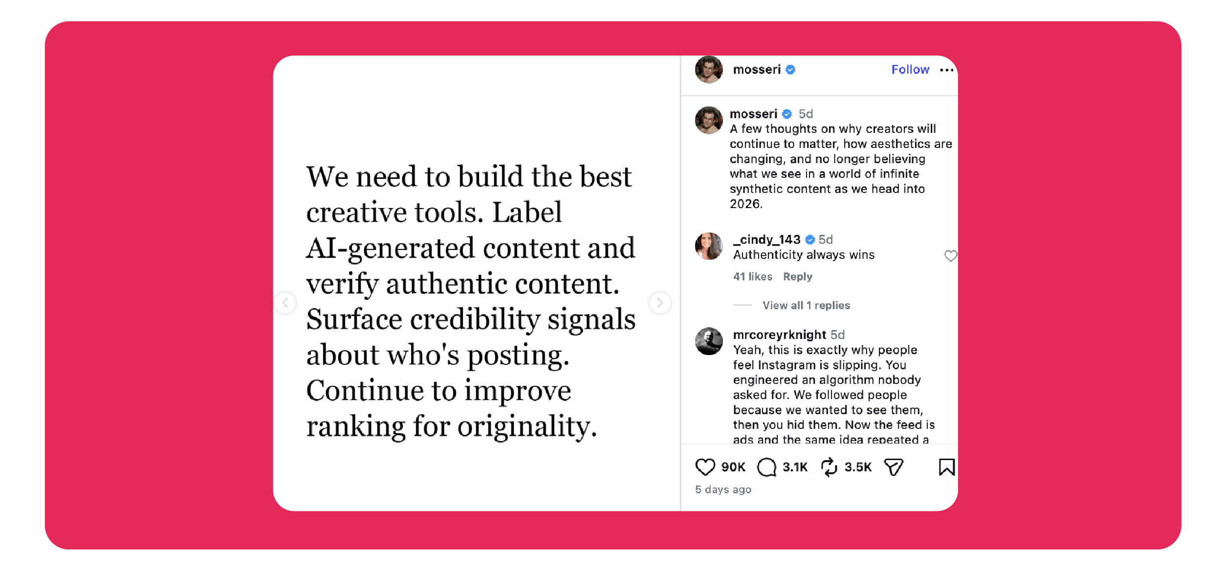 Instagram chief Adam Mosseri dropped a truth bomb most creators already know but don’t want to admit: authenticity is becoming infinitely reproducible.