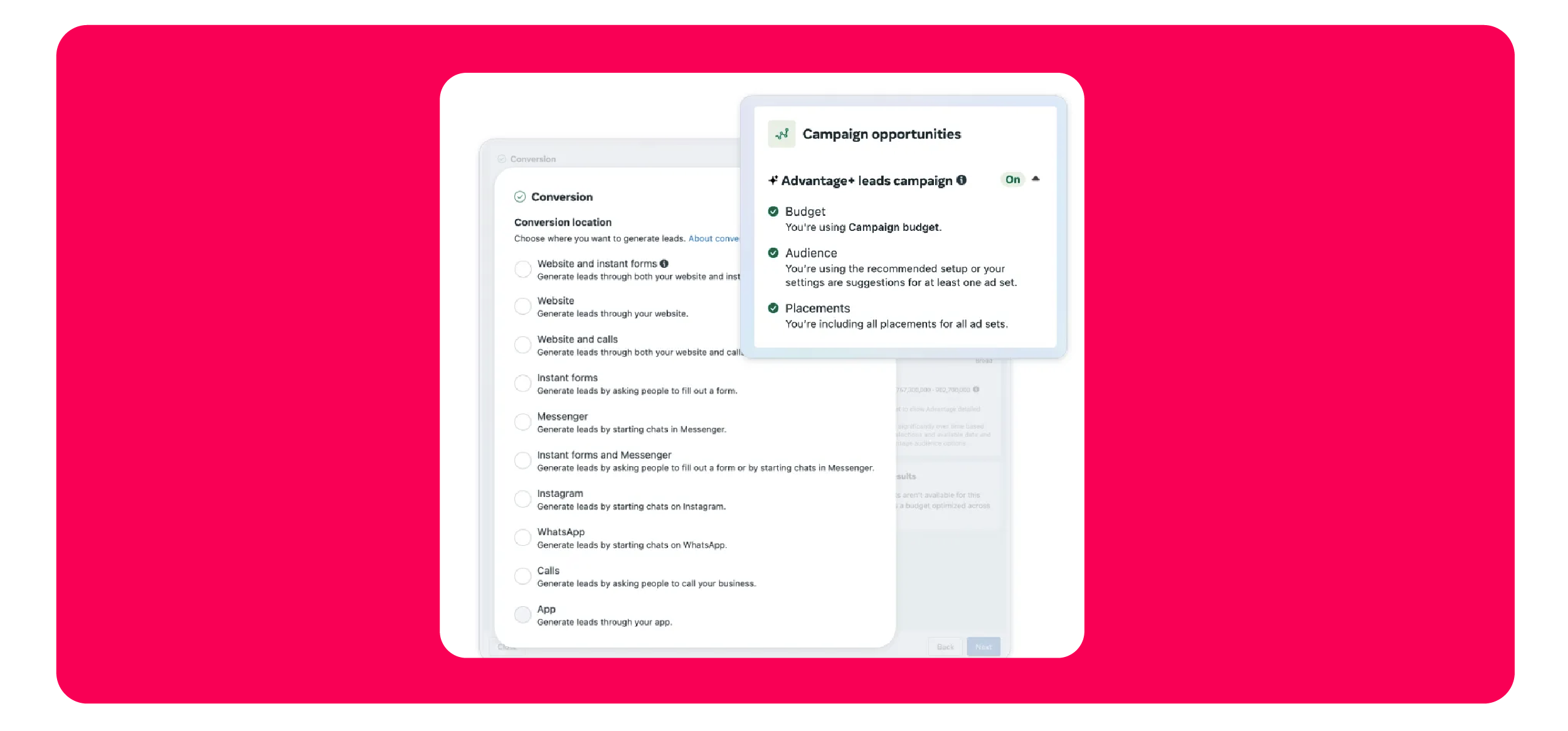 For the nerds among us (affectionate), there are also some backend improvements, including dual-location optimization, which lets a single campaign show instant forms to people who want quick submissions, and website forms to people who need more context. Meta is also expanding conversions API integration, allowing up to 100,000 lead events to be sent for free if you’re using Zapier. Plus, streamlined targeting that lets you optimize for a single conversion event directly in the ad creation flow, instead of going through a multi-stage setup process.