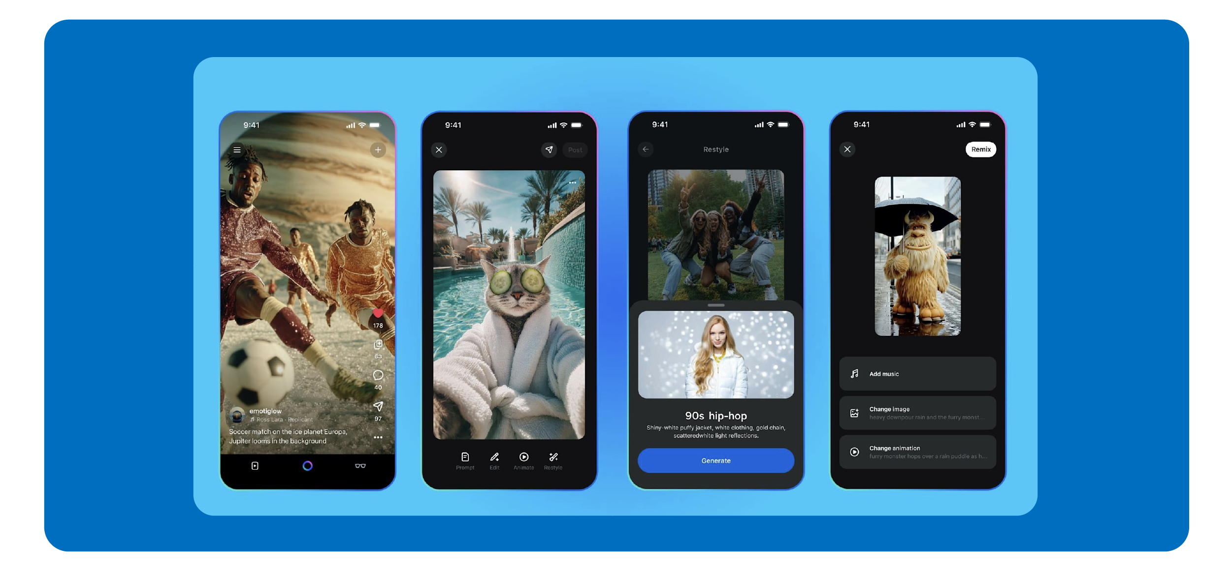 The user experience is straightforward: you can generate a video from scratch or “remix” something from your feed. Before posting, you can add music, adjust styles, and layer in new visuals. Then you’re free to share your synthetic creation to the Vibes feed, message it to friends, or cross-post to Instagram and Facebook.