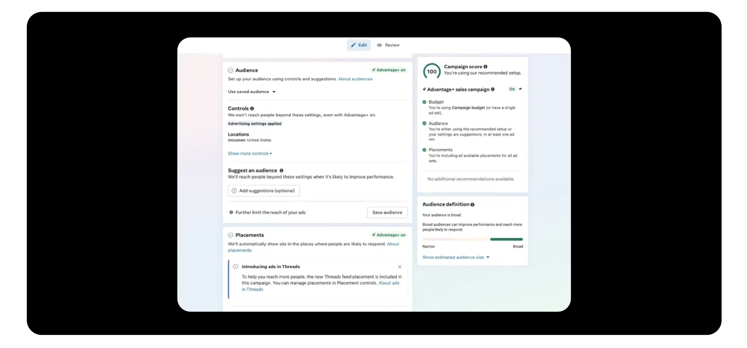 Previously, activating Advantage+ required a conscious choice, a deliberate click into AI-powered optimization. Now, it’s integrated into your campaign setup. Audience targeting? Placements? Budget optimization? Advantage+ is automatically on. Meta has even introduced an “Opportunity Score,” a 0-100 rating that grades how well you’re playing along with their AI recommendations.