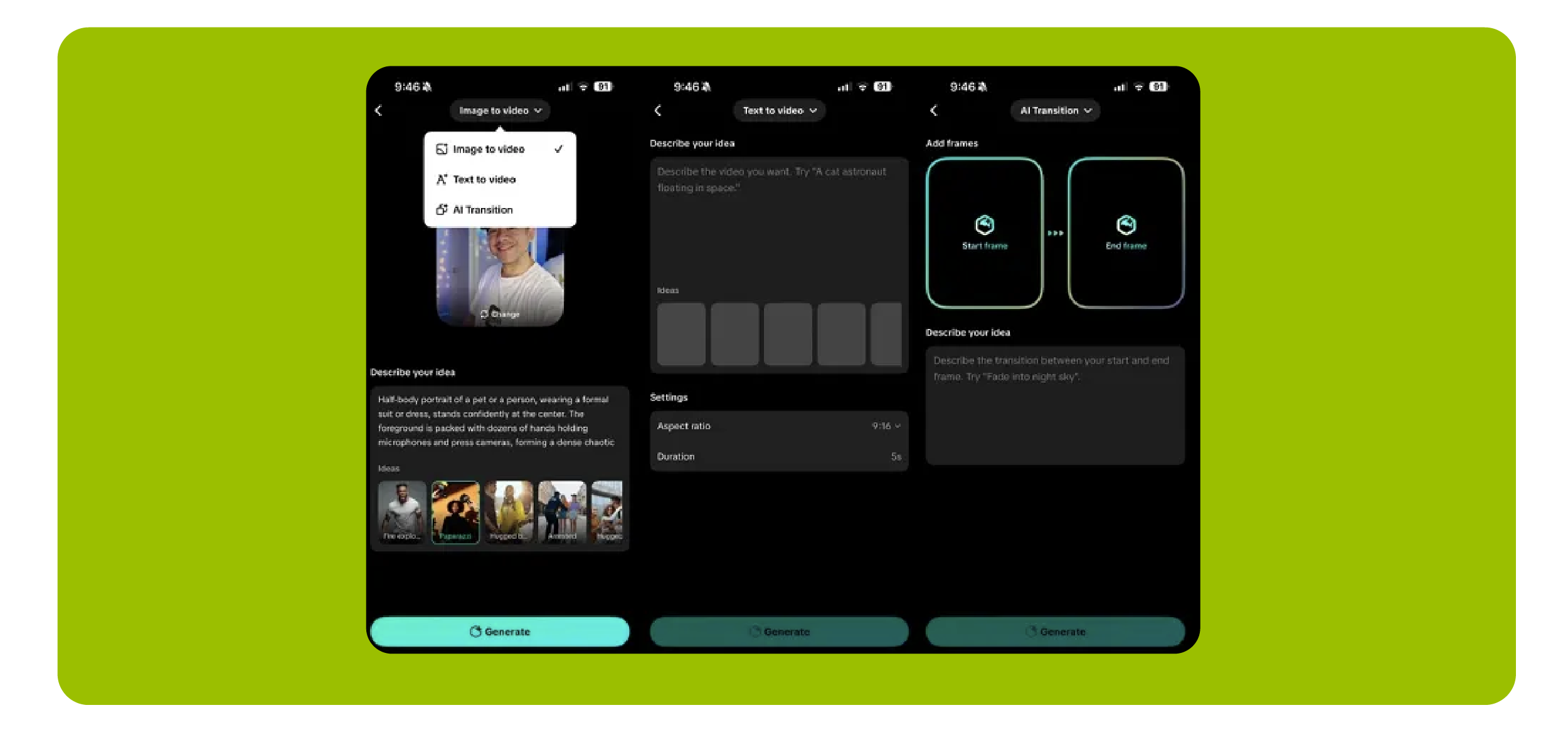 The new suite of generative AI tools includes text-to-video creation, image animation, and smart transitions. These features give creators more creative control, whether they’re building cinematic edits or just making their daily vlogs pop.