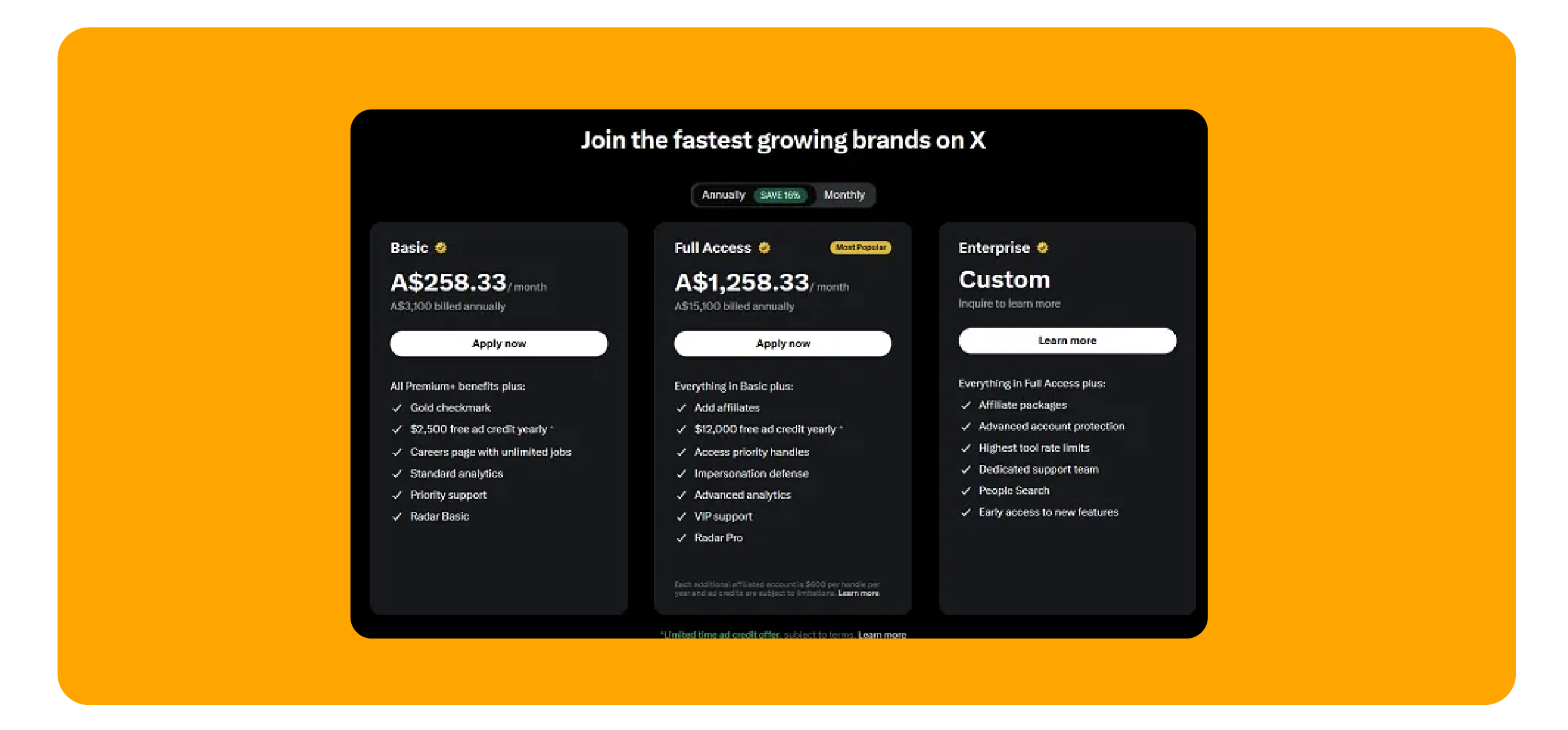 - Enterprise Tier – Custom Pricing: X describes this as offering “advanced tools, account management, and maximum support for your unique goals.” Translation: if you have to ask how much it costs, it’s probably a lot.