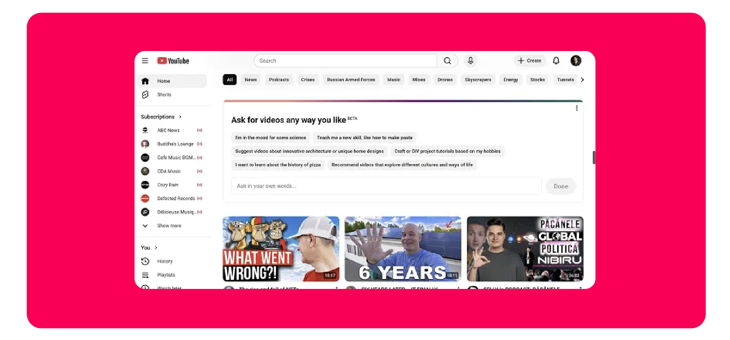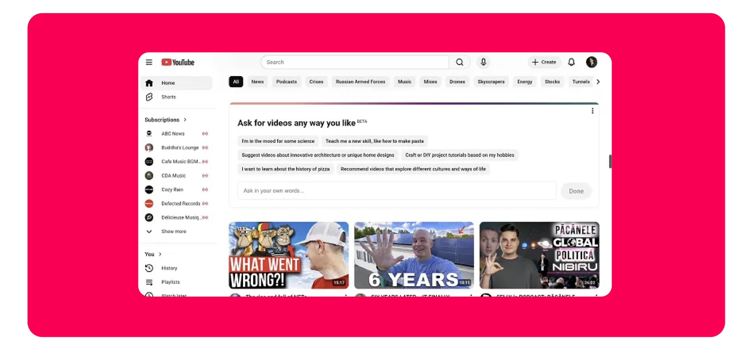 The feature appears as a chip labeled “Your Custom Feed” on your homepage, sitting beside the standard “Home” option. Select it, enter a prompt about what you’d like to see, and YouTube’s AI weighs your input against its existing algorithmic understanding of your viewing habits. The key word is “weighs.” This isn’t a complete override, you’re not replacing YouTube’s recommendations with a manually curated feed. Instead, you’re introducing new variables into an equation that already includes your watch history, search patterns, and engagement metrics.